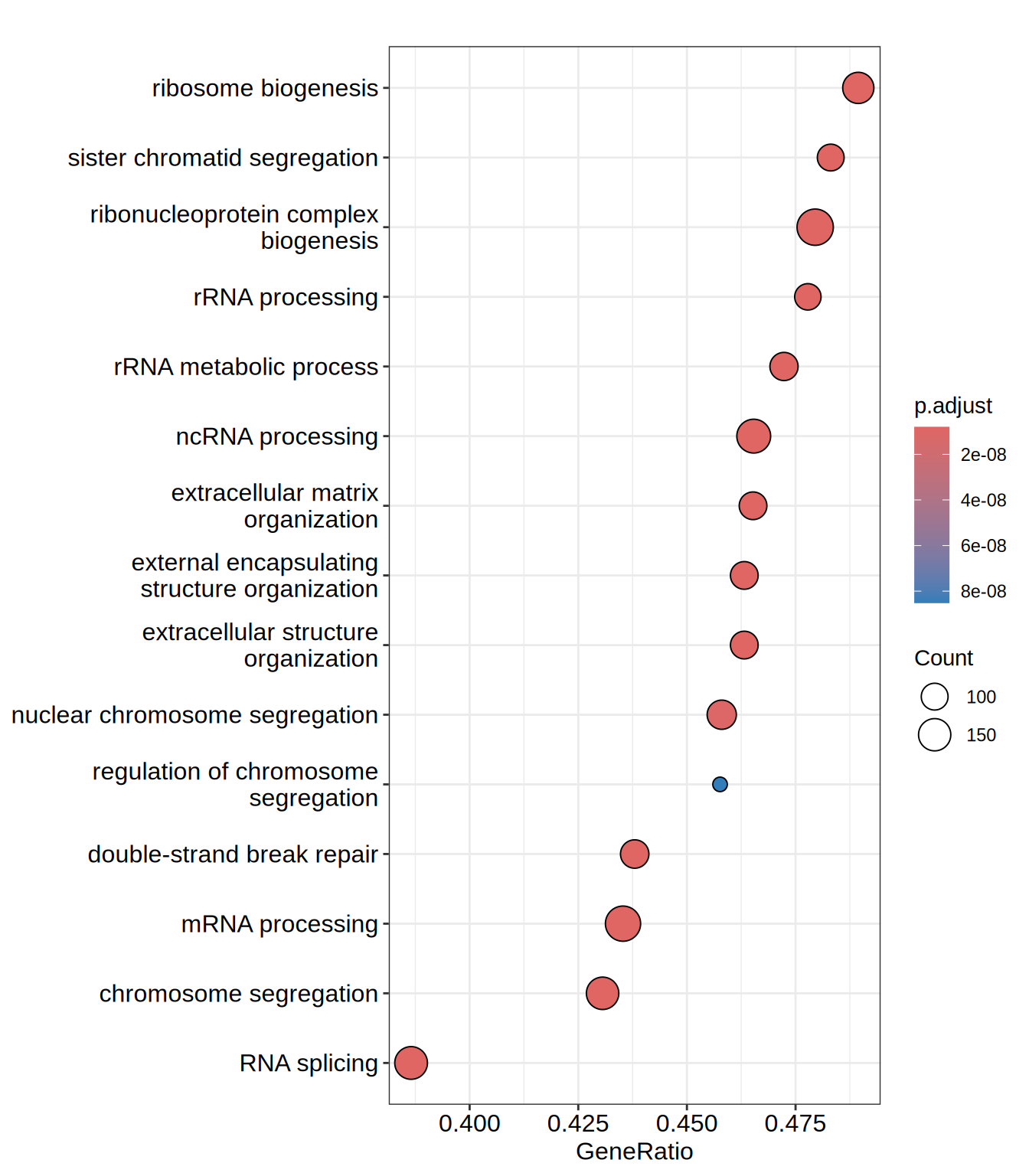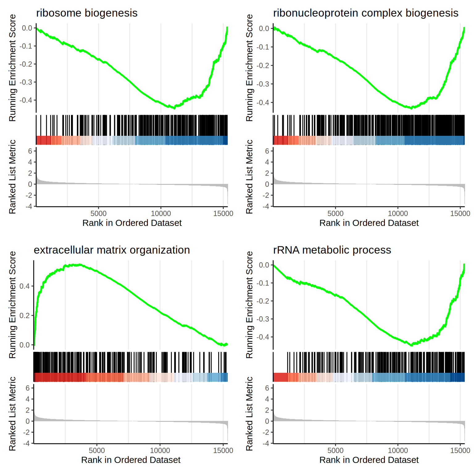 | GO:0042254 | GO:0042254 | ribosome biogenesis | 284 | -0.4475101 | -2.315861 | 0 | 0 | 0 | 4287 | tags=49%, list=28%, signal=36% | CINP/NSUN4/RPS23/NIP7/ERAL1/YBEY/RPS15/RPUSD2/RPL7L1/WDR46/GAR1/SBDS/RPS28/GEMIN4/BRIX1/EIF5/DCAF13/KAT2B/ABCE1/RPP25/SUV39H1/FBL/UTP18/HEATR3/RSL1D1/EIF2A/LTV1/NGDN/TSR1/RAN/NOP10/PA2G4/NOLC1/BYSL/MDN1/MRPS2/C1orf131/NOL8/MPV17L2/IMP3/WDR55/RRP1/FCF1/SURF6/UTP15/NUP88/RPL23A/FTSJ3/REXO4/PWP1/EXOSC3/DKC1/GTPBP10/FDXACB1/CUL4B/NOC4L/PWP2/EIF4A3/XRN2/URB1/SHQ1/RPP30/IMP4/MAK16/RPL26L1/EBNA1BP2/HEATR1/RRS1/RRP15/EXOSC10/DDX28/DDX21/DDX27/XRCC5/WDR43/RRP36/NSUN5/ISG20L2/EIF1AX/DDX47/ABT1/MRPL20/AATF/MPHOSPH10/TRMT112/NOL10/DDX54/NAT10/TSR2/NOC2L/EXOSC5/C1QBP/ERI3/DDX18/PELP1/TRMT2B/POP4/CUL4A/SDAD1/EXOSC6/UTP14A/EIF6/DHX30/NOL11/DDX49/WDR74/PES1/LSG1/NOP14/NOP16/DDX56/KRI1/DDX51/PDCD11/RPS19BP1/NOL9/NGRN/NOL6/MRTO4/GNL3L/SIRT7/NOP2/NHP2/EMG1/RPUSD4/RRP1B/RPSA/RRP7A/NLE1/RRP9/URB2/RPP40/GRWD1/MRPS7/PPAN/MYBBP1A/UTP20/DHX37/RPUSD1 |
