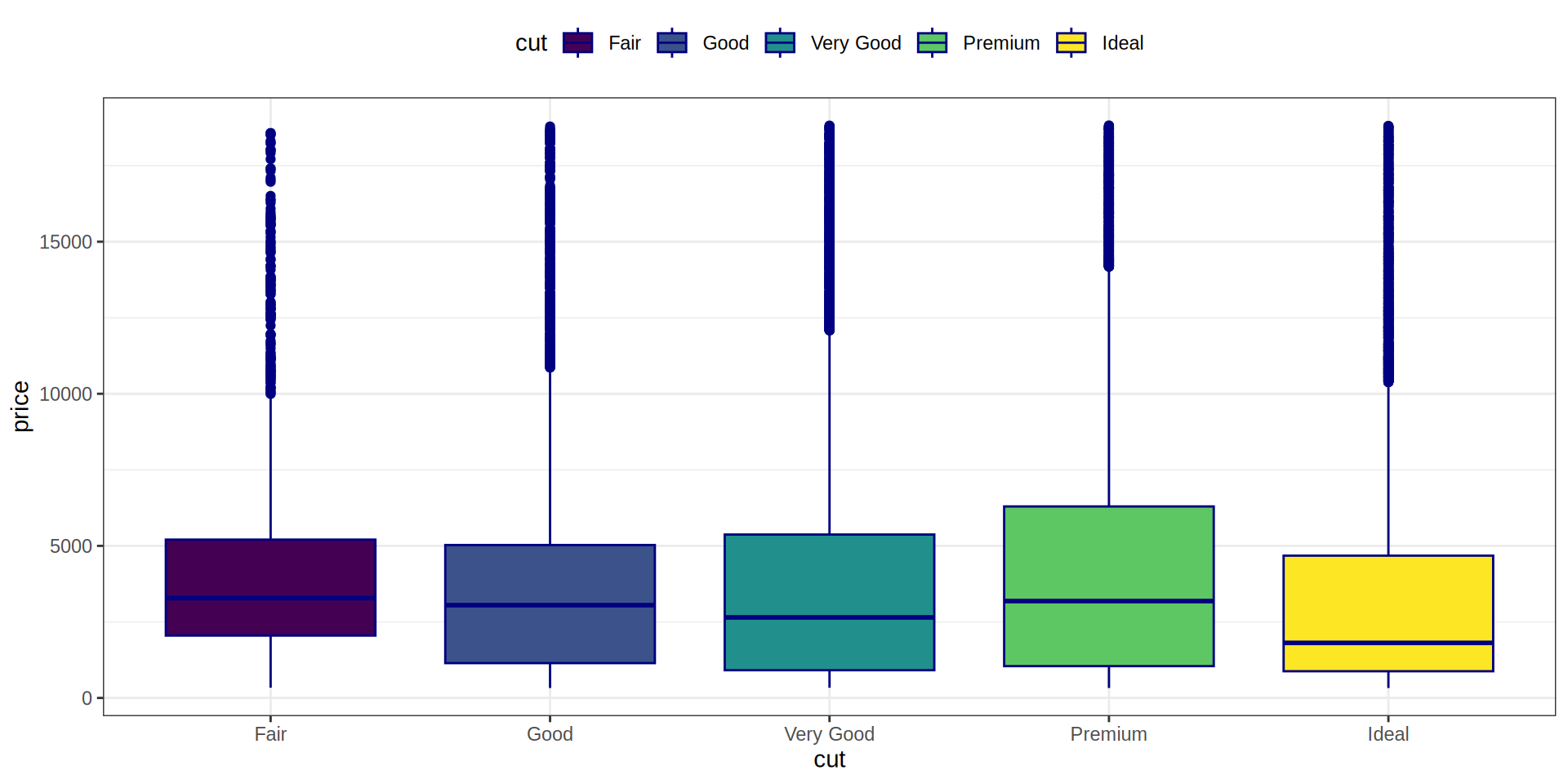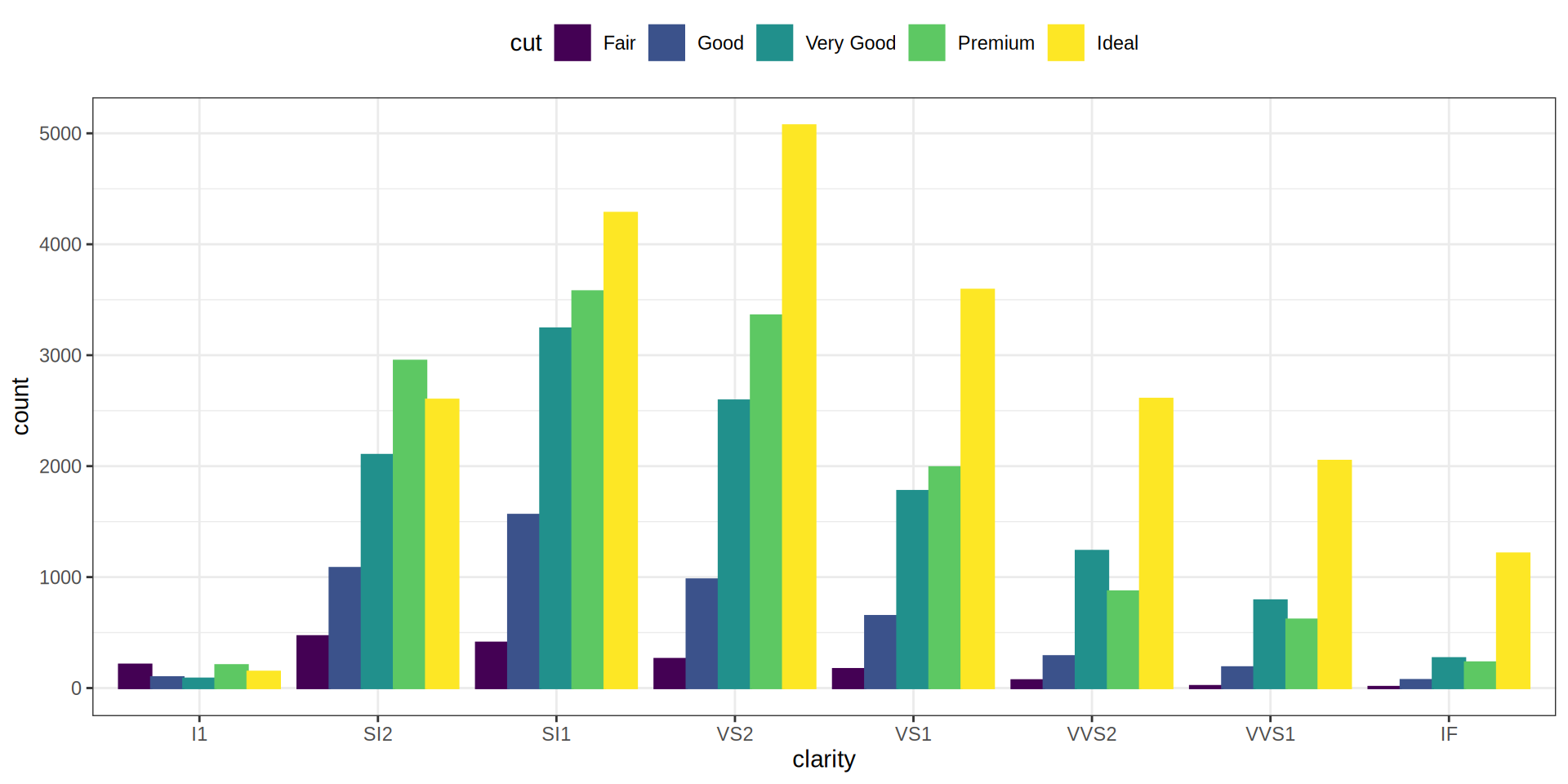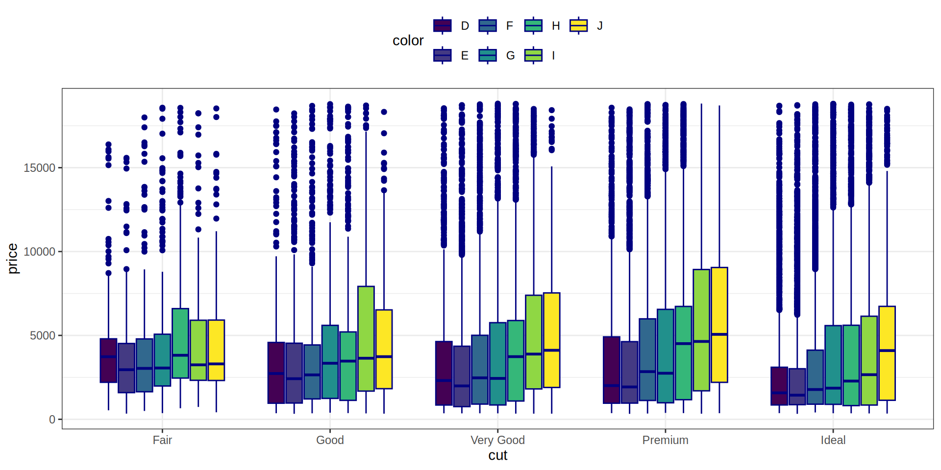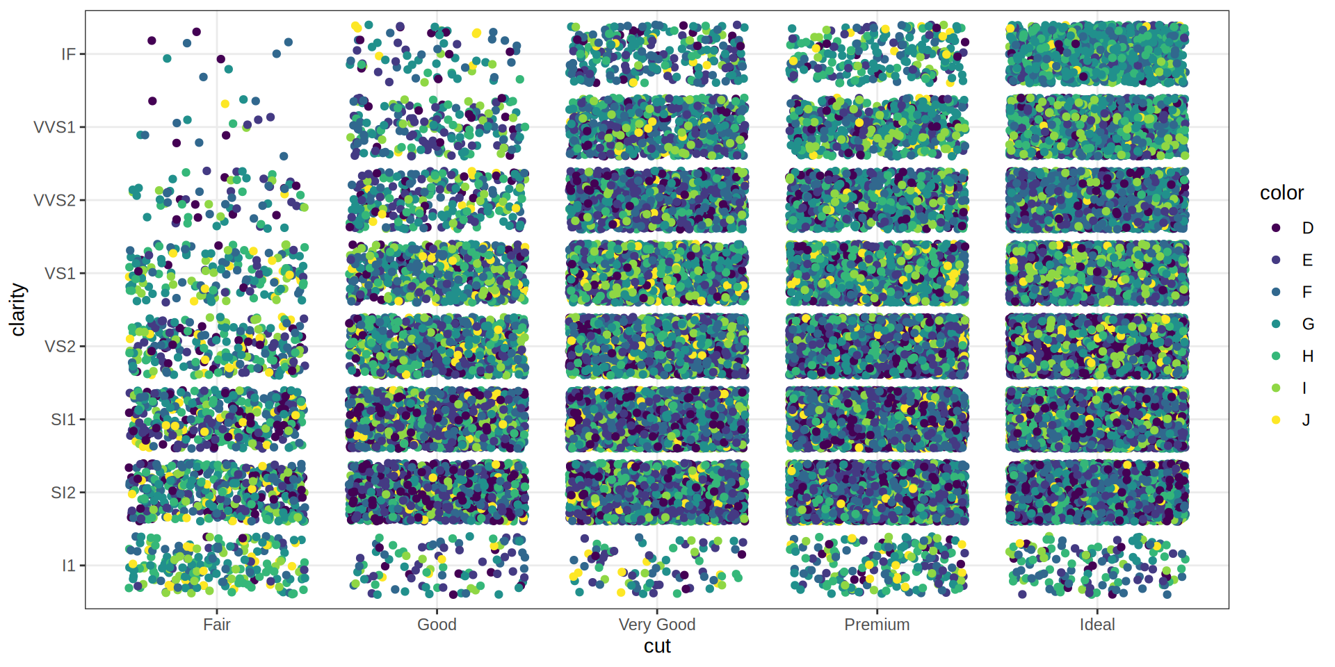Coloreamos los puntos agrupados por la variable cut. Además movemos la leyenda a la parte superior
